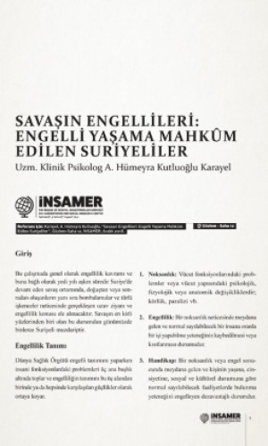 Bu çalışmada genel olarak engellilik kavramı ve buna bağlı olarak yedi yılı aşkın süredir Suriye’de devam eden savaş ortamında, doğuştan veya sonradan oluşanların yanı sıra bombalamalar ve türlü işkenceler neticesinde gerçekleşen uzuv ziyanı ve engellilik konusu ele alınacaktır. Savaşın en kirli yüzlerinden biri olan bu durumdan günümüzde binlerce Suriyeli muzdariptir.