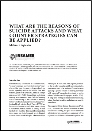 Suicide attacks, also known as ‘human bombs’, ‘suicide bombings’ and ‘suicide terrorism’ interchangeably, have become an international endemic, especially within the Middle East with terrorist groups such as the PKK and ISIL using it as a means to try fulfill their political goals being to setup an autonomous state. Suicide bombing attacks first coming to the forefront in the early 1980’s with Hezbollah and then reaching a ‘professional level’ with the Tamil Tigers (LTTE) has been on the increase recently. One country being a part of this painful process is Turkey. Within the last five months, three suicide attacks had taken place, one in Ankara and two in Istanbul with the latest attack being in Taksim (Milliyet Newspaper, 19 Mar. 2016). This paper hypothesizes that in order to pacify suicide terrorism attacks, root causes need to be analyzed first rather than applying a general concept of security, especially with means of ‘entrusting the streets to police officers’ (Haberturk Newspaper, 09 Mar. 2016). A long term strategy is needed internationally, rather than just tweaking and changing security procedures.